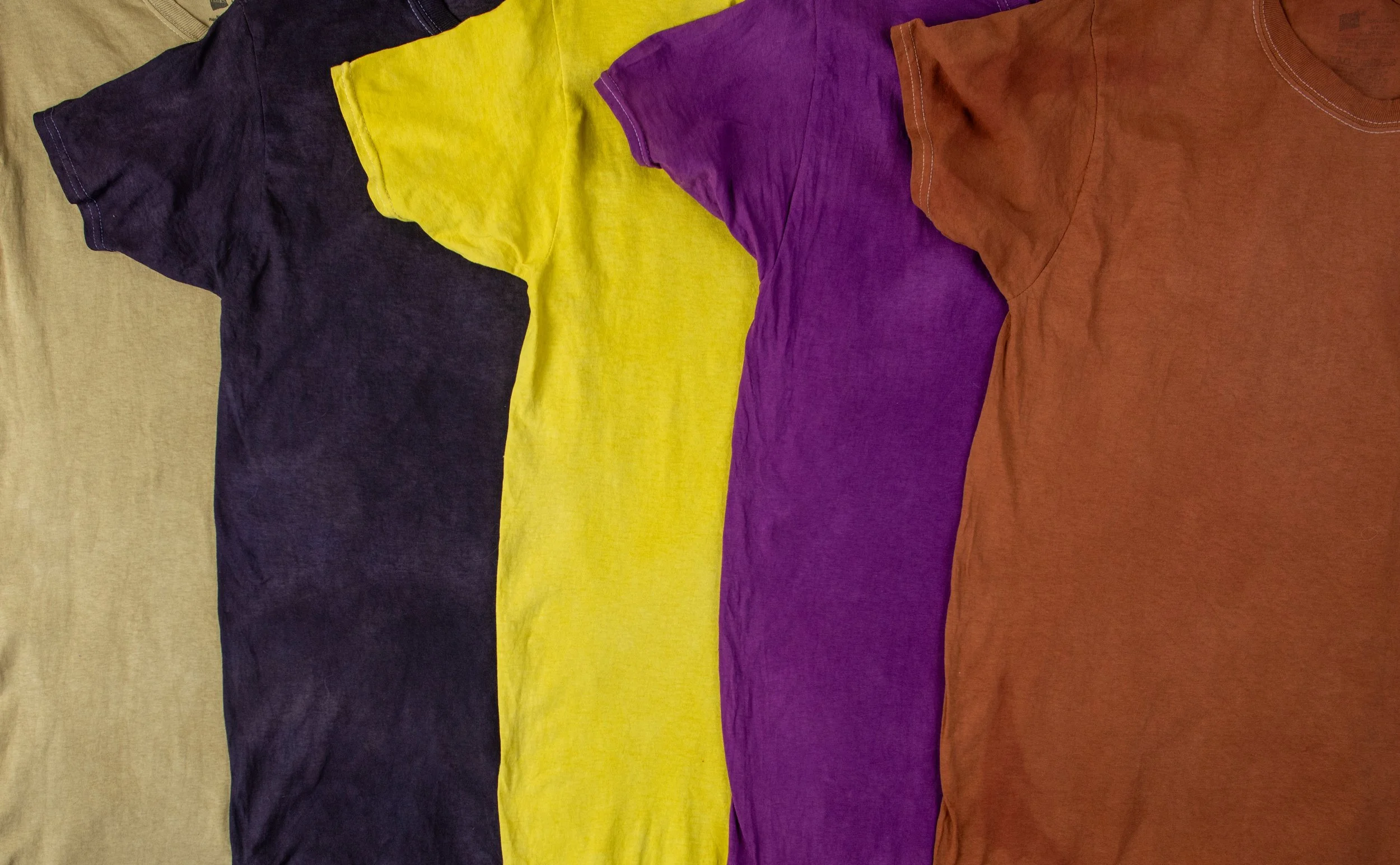 When the cotton or linen has been thoroughly rinsed, proceed directly to dyeing. The swatches above show cotton tshirts mordanted and dyed with Aluminum Formate Pro, using different combinations of tannins and dyes [see Note 3].